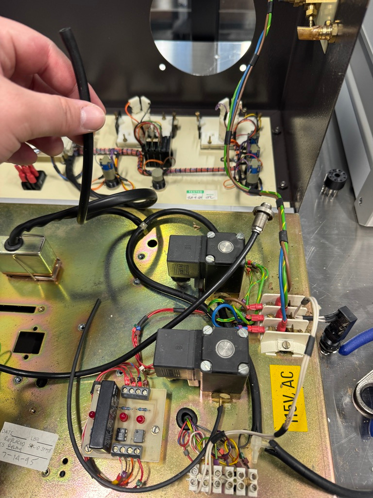 The argon hoses, pictured here, are decaying and falling out. These must be replaced with PTFE tubing.