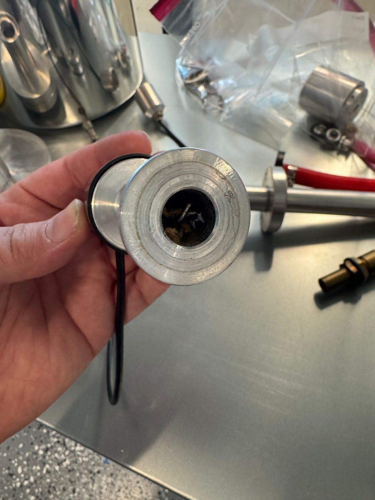 After disassembling the vacuum system and pulling the Pirani gauge out, I noticed it was absolutely chaulk full of random debris. This is not great. We need to gently clean what we can with low airflow and hand tools, and then get it into an ultrasonic cleaner. The gauge itself should be replaceable by a similar model if cleaning doesn’t yield a good result.