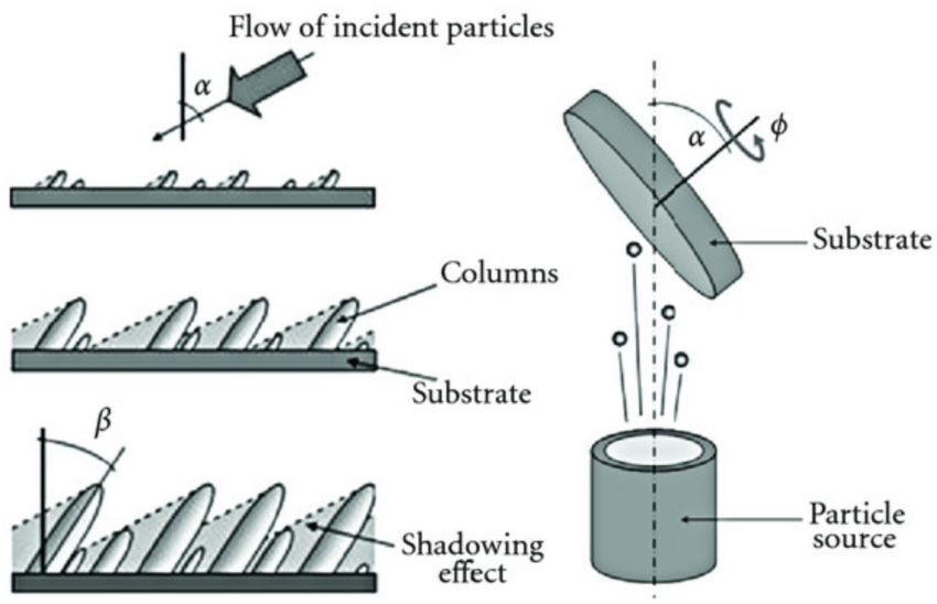 An example of the ballistic shadowing effect during thin film growth in a vacuum chamber. Image from ResearchGate, Copyright 2020 Adriano Panepinto and Rony Snyders.